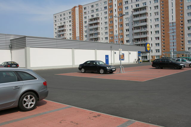 Nach Beräumung des mit einer stark verfallenen Mehrzweckhalle bebauten Grundstücks, entstand hier ein Verbrauchermarkt mit den zugehörigen Außenanlagen.